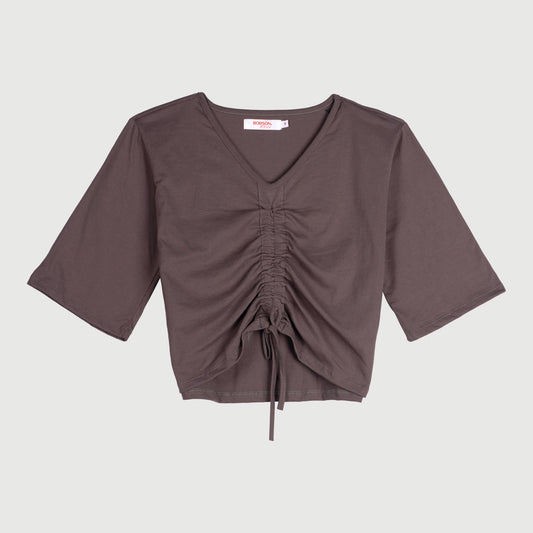 Bobson Japanese Ladies Basic V Neck Tees with Adjustable Front String Trendy Fashion High Quality Apparel Comfortable Casual Top for Women Cotton Spandex Boxy Fit 142011 (Pavement)