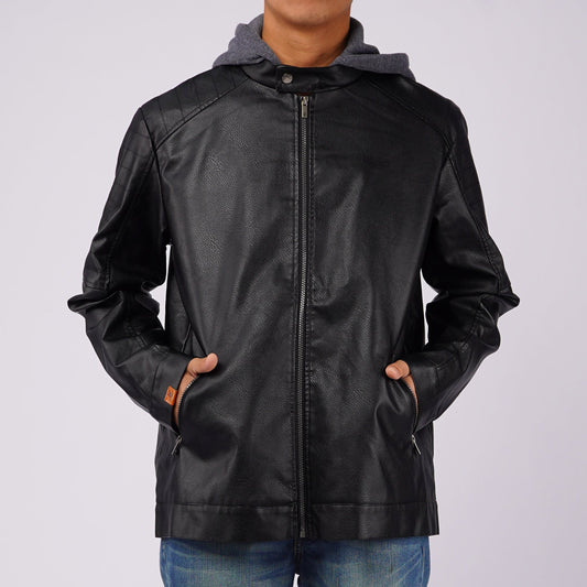 RRJ Men's Basic Hoodie Leather Jacket Regular Fitting 137606 (Black)